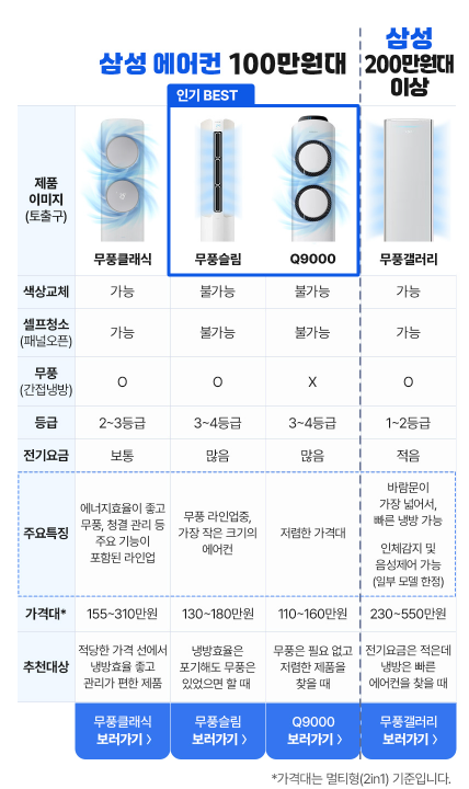 - Q9000: 가격은 가장 저렴하지만 무풍 기능이 없는 경우가 많음