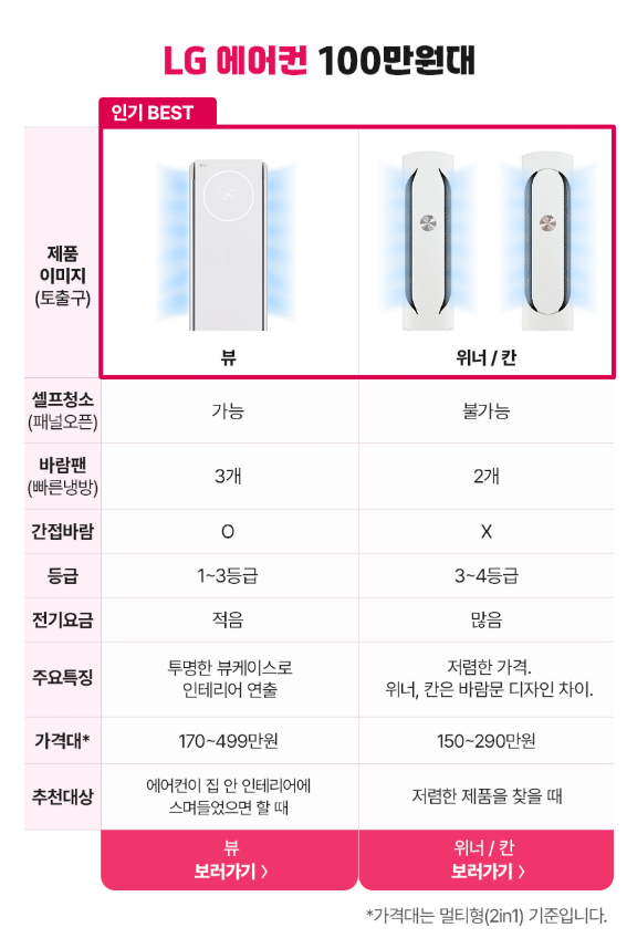 - 뷰(View): 셀프청소 가능, 3개의 바람팬으로 빠른 냉방, 인테리어와 조화되는 투명 뷰케이스가 장점
